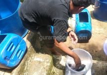 - Sediakan wadah lain sebagai tempat penampungan ikan sementara bisa menggunakan drum yang besar. Jumlah ikan di dalam wadah penampungan diusahakan tidak terlalu padat dan disesuaikan dengan ukuran ikan gurame yaitu sekitar 30-40 kg/drum.